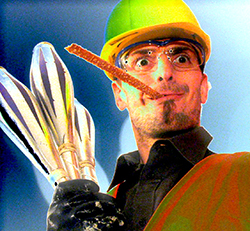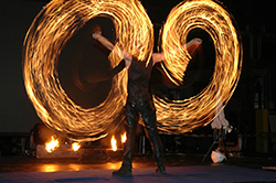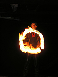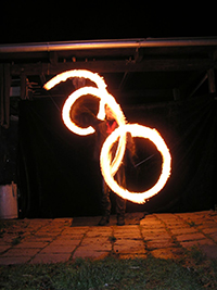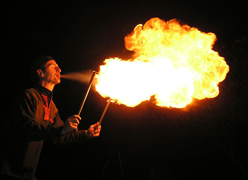 Ein Brandschutzteppich (6 mal 5 Meter) schützt empfindliche Bodenbeläge drinnen und draußen. Feuerlöscher und Abdämpfdecken liegen bereit, sie wurden in 15 Jahren noch nie gebraucht. Indoor ist eine Raumhöhe von 5 Meter nötig, es kommt eine genormte nicht rußende Brennflüssigkeit zum Einsatz.